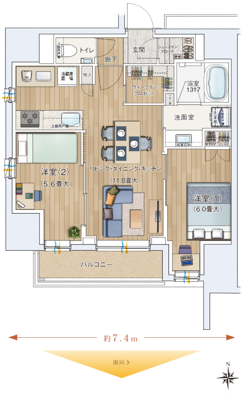 南向き角住戸で日当たり良好、明るく開放的